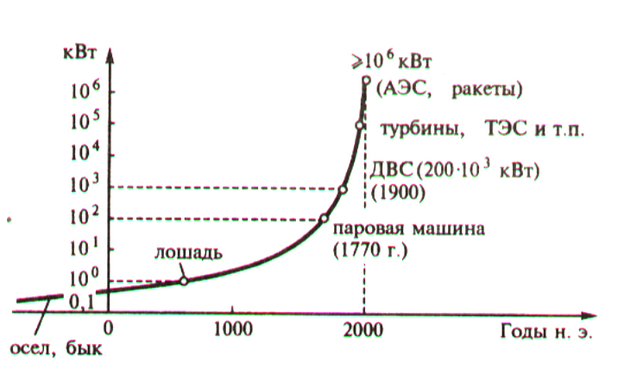 Энергетические уровни техногенных воздействий существенно возросли в XX столетии, когда человек получил в своё распоряжение мощную технику (см. рисунок), огромные затраты углеводородного сырья, химических и бактериологических веществ. В итоге история человечества породила очередной парадокс – в течение многих столетий люди совершенствовали технику, чтобы обезопасить себя от естественных опасностей, а в результате пришли к наивысшим техногенным опасностям, связанны с производством и использованием техники и технологий.