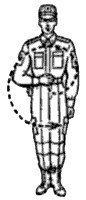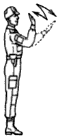 | 13 | В колонну | Поднять правую руку вверх и опустить ее, держа предплечье вертикально (повторять до отзыва) | То же, с желтым флажком в правой руке | Фонарь с зеленым светом вначале держать неподвижно, а затем сигнал «Марш» повторять до отзыва |