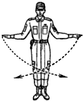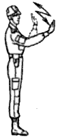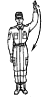 | 3 | К машинам | Поднять обе руки вверх и держать до исполнения | То же, имея в правой руке желтый, а в левой — красный флажок | Фонарем с белым светом размахивать перед собой вправо и влево на уровне плеча |