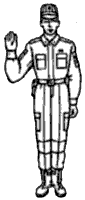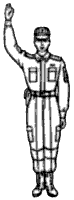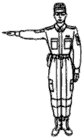 | 7 | Марш (вперед, продолжать движение в прежнем или новом направлении, путь свободен) | Поднять правую руку вверх, повернуться в сторону движения и опустить руку в направлении движения на уровне плеча | То же, с желтым флажком в правой руке | Фонарем с зеленым светом размахивать по вертикали вверх и вниз |