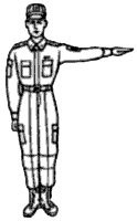 | 15 | Все направо (налево) | Вытянуть левую руку горизонтально в сторону, а правую руку поднять вверх, повернуться в сторону поворота и размахивать правой рукой вверх и вниз до уровня плеча (повторять до отзыва) | То же, имея в правой руке желтый, а в левой — красный флажок | Фонарем с зеленым светом размахивать по вертикали сверху вниз и в сторону поворота |