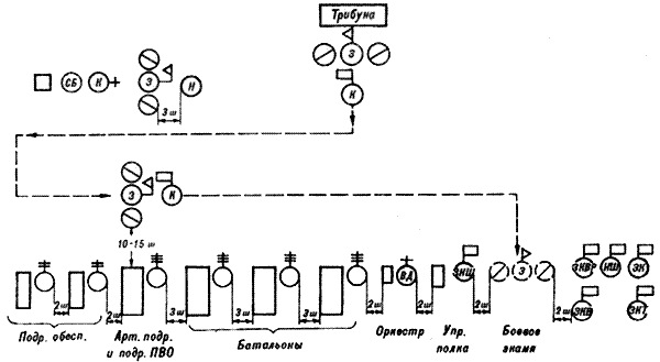 | 12 | В линию колонн | В линию взводных колонн: поднять обе руки вверх и размахивать ими накрест над головой | То же, имея в правой руке желтый, а в левой — красный флажок | Фонарем с зеленым светом размахивать над головой вправо и влево, описывая полукруг |