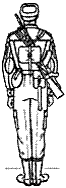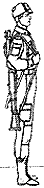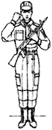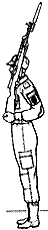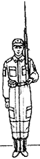 третий прием — быстро перебросить карабин (ручной пулемет) за плечо; левую руку опустить; правую руку опустить по ремню так, чтобы предплечье было в горизонтальном положении; карабин (ручной пулемет) слегка прижать локтем к телу (рис. 8, г, д).