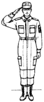 | 62. Для выполнения воинского приветствия в движении вне строя без головного убора за три-четыре шага до начальника (старшего) одновременно с постановкой ноги прекратить движение руками, повернуть голову в его сторону и, продолжая движение, смотреть ему в лицо. Пройдя начальника (старшего), голову поставить прямо и продолжать движение руками. При надетом головном уборе одновременно с постановкой ноги на землю повернуть голову и приложить правую руку к головному убору, левую руку держать неподвижно у бедра (рис. 12); пройдя начальника (старшего), одновременно с постановкой левой ноги на землю голову поставить прямо, а правую руку опустить. При обгоне начальника (старшего) воинское приветствие выполнять с первым шагом обгона. Со вторым шагом голову поставить прямо и правую руку опустить. |