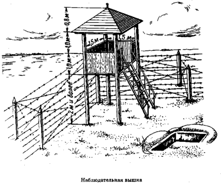 Для удобства наблюдения за подступами к охраняемому объекту между ограждениями (у внешнего ограждения) могут устраиваться наблюдательные вышки, оборудованные средствами связи, сигнализации, прожекторами и молниезащитными устройствами.