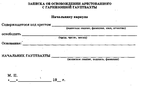 37. Для освобождения арестованного с гарнизонной гауптвахты начальник гауптвахты накануне окончания срока ареста направляет начальнику караула записку об освобождении арестованного и сообщает о времени освобождения арестованного командиру его подразделения (воинской части) для высылки за ним представителя.