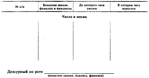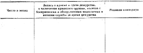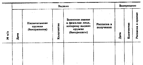 Примечания: 1. Оружие личному составу, кроме пистолетов, выдается дежурным по роте только по приказу командира роты или старшины роты, а пистолеты солдатам и сержантам — старшиной роты только с разрешения командира роты. При выходе подразделений по тревоге, на учения или занятия, а также при выдаче для чистки за полученное оружие и боеприпасы расписывается в книге командир взвода или его заместитель, а при наступлении в караул — начальник караула. Оружие одиночным военнослужащим выдается под их личную подпись. 2. Боеприпасы для караула выдаются с разрешения командира роты, а дежурному подразделению — по приказу дежурного по полку лично старшиной роты, он же принимает эти боеприпасы и расписывается в книге. 3. В целях ускорения выдачи оружия и боеприпасов на случай тревоги в книге, в специально отведенном месте, заблаговременно делается запись, которая при необходимости уточняется. Подпись за полученные оружие и боеприпасы ставится во время их получения. .