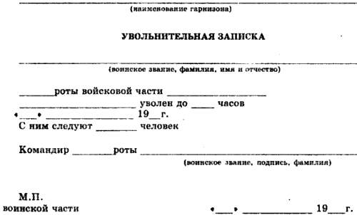 Примечания: 1. Если с увольняемым следуют другие военнослужащие, проходящие военную службу по призыву, то в увольнительной записке в строке «С ним следуют _______ человек» прописью указывается количество человек. 2. Бланки увольнительных записок размером 10х8 см изготавливаются в типографиях.