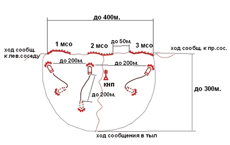 Протяженность позиции отделения до 100 м. Между позициями отделений расстояние до 50м. и для связи между ними отрывается ход сообщения. От отделений, расположенных на флангах взвода отрываются хода сообщения к левому и правому соседу. От среднего отделения обычно отрывается ход сообщение на КНП командира взвода и далее в тыл.