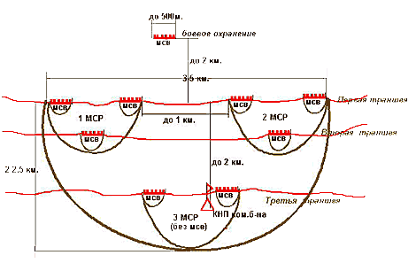 Боевые порядки МСВ преднамеренно показаны в предельно упрощенном виде. Здесь не показаны запасные и отсечные позиции, окопы БМП, позиции огневых средств усиления и поддержки, заграждения, минные поля, пункт боепитания, пункт водоснабжения, средств связи.
