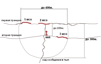 КНП командира батальона располагается на удалении до 2 км. от переднего края, обычно в опорном пункте роты второго эшелона.
