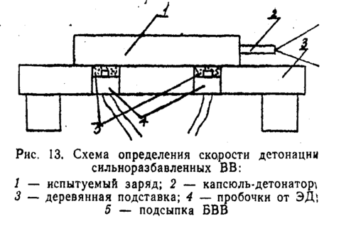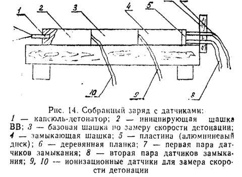 При определении скорости детонации в зарядах из порошкообразных, пластичных, пастообразных или гранулированных составов датчики, изготовленные из 2-х скрученных между собой проводов, вводят в заряд после его формирования или готовят испытание по схеме (см. рис. 13). Готовый заряд устанавливают на деревянную подставку и закрепляют при помощи пластилина, В случае определения массовой скорости ПД в испытуемом заряде, путем замера скорости движения свободной поверхности инертной пластины, к торцу замыкающей шашки приклеивается алюминиевый диск. При этом его толщина в сериях опытов может меняться с целью обнаружения излома на зависимости W(l) (см. рис. 3). Это позволяет рассчитать массовую скорость ПД в плоскости Чемпена-Жуге.