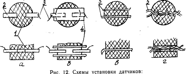 При определении скорости детонации в порошкообразных, пластичных .пастообразных, гранулированных и жидких составах применяются ионизационные датчики в виде двух проводов марки ПЭЛШО или ПЭЛ, скрученных между собой (рис. 12,г).
