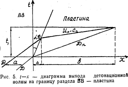 Найдя толщину пластины (l=b), в которой происходит затухание химпика от ВВ в материале, и зная скорость процесса, можно вычислить ширину ЗХР. Условие равенства времен для ВВ по t—x — диаграмме может быть записано