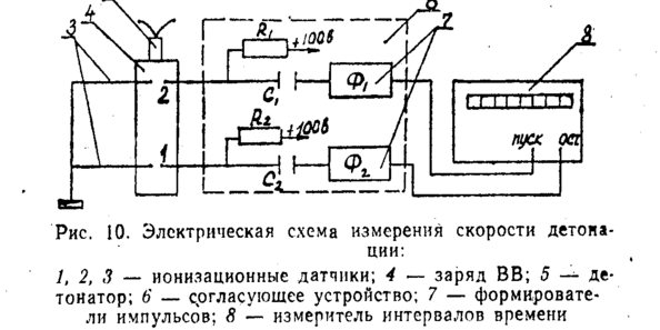 В детонационной волне продукты взрыва, находящиеся под большим давлением и высокой температурой, сильно ионизированы. Плотность электронов достигает 1017 —1020 на 1 см3, что выше, чем проводимость полупроводников. В исходном же состояния ВВ, как правило, хорошие изоляторы. Резкое . изменение электрического сопротивления в момент прохождения детонационной волны используют для определения скорости детонация. Для этого в исследуемом заряде ВВ, на точно известном расстоянии друг от друга, располагают два или более ионизационных датчика, на которые подают определенное электрическое напряжение.. В момент прохождения детонационной волны сопротивление ионизационных датчиков резко изменяется, что вызывает скачки напряжения в согласующей электрической схеме (.формирователе импульсов), которые подаются .на регистратор промежутков времени. В качестве такого регистратора могут, использоваться хронометр, осциллограф или частотомер, С их помощью измеряется промежуток времени между моментами замыкания датчиков. Данный метод является основным методом определения скорости детонации и регламентирован ГОСТ.