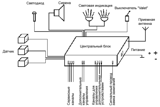 Разберемся, из чего же состоит подавляющее большинство автосигнализаций, которые можно встретить на рынке охранных систем. На рисунке схематично представлены основные элементы такой системы. Рассмотрим назначение каждого из них.