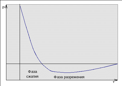Перед фронтом ударной волны давление в воздухе равно атмосферному Р0. С приходом фронта ударной волны в данную точку пространства давление резко (скачком) увеличивается и достигает максимального, затем, по мере удаления фронта волны, давление постепенно снижается и через некоторый промежуток времени становится равным атмосферному. Образовавшийся слой сжатого воздуха называют фазой сжатия. В этот период ударная волна обладает наибольшим разрушающим действием. В дальнейшем, продолжая уменьшаться, давление становится ниже атмосферного и воздух начинает двигаться в направлении, противоположном распространению ударной волны, то есть к центру взрыва. Эта зона пониженного давления называется фазой разрежения.