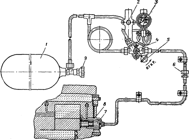 1-баллон; 2-зарядный штуцер; 3 - манометр редуктора; 4 - редуктор- 5 - рукоятка редуктора; 6- разъемное устройство, используемое при консервации двигателя; 7 - воздухораспределитель; 8 - воздухопровод; 9 - запорный вентиль