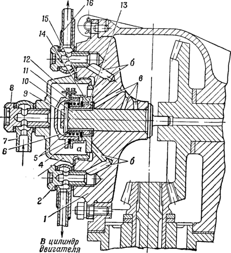 Детали воздухораспределителя смазываются маслом, забрасываемым из корпуса привода топливного насоса, для доступа которого к валику 10 и распределительному диску просверлены отверстия в.