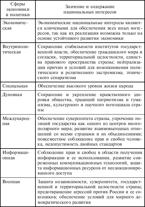 Национальные интересы России – это совокупность сбалансированных интересов личности, общества и государства в экономической, внутриполитической, социальной, международной, информационной, военной, пограничной, экологической и других сферах (табл. 1). Эти интересы носят долгосрочный характер и определяют стратегические цели и текущие задачи внутренней и внешней политики Российской Федерации.