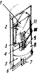 1 - кумулятивна виїмка; 2 - заряд ВР; 3 - капсюль-воспламенитель; 4 - ударник; 5 - вишибной заряд; 6 - воспламеняющий заряд; 7 - электрозапал; 8 - паперовий диск; 9 - запобіжна чека; 10 - запобіжна пружина; 11 -капсуль-детонатор