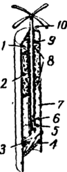 1 і 4 - парафін; 2 – осколки; 3 - дерев'яна пробка; 5 - цвях, 6 - капсюль-воспламенитель; 7 – порох; 8 - паперові прокладки; 9 - пази для запобіжної чеки; 10 - штук