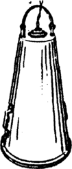 Конічна міна (мал.2-37) виготовляється найпростішим способом із клепаного тонкого листового металу. Заряд тротилу ініціюється за допомогою двох взривачів натяжної дії, що мають уповільнення спрацьовування 9 сек. Таке уповільнення дозволяє диверсанту, що застосовує міну, іти на безпечну відстань до її нариву. Вибуховий пристрій - місцевого виробництва. Воно складається з двох розташованих поруч вогневих ланцюгів з роздільними натяжними шнурами, воспламенителями і капсулями-детонаторами. Вогневі ланцюги містяться в банку з-під олії, що розташовується у верхній частині заряду міни і кріпиться за допомогою п'яти гвинтів. Подвійна система запалення збільшує надійність спрацьовування. Мина має ручку для перенесення і дві опори для правильної установки в місці застосуванні.