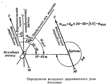 Определение исходного дирекционного угла. Исходным дирекционным углом называется угол в исходной точке между северным направлением вертикальной линии сетки карты и продольной осью машины. Если машина на исходной точке установлена так, что ее продольная ось совпадает с направлением на выбранный ориентир, то исходный дирекционный угол аисх будет равен дирекционному углу направления на ориентир, который предварительно измерен по карте. Однако точно и быстро совместить ось машины с направлением на ориентир трудно. Поэтому для определения исходного дирекционного угла поступают так.