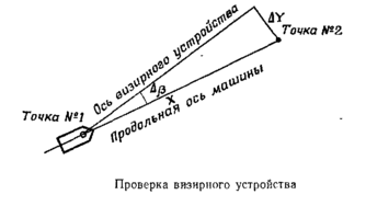 На ровной дороге выбирают прямолинейный участок длиной около 1000 м и выставляют вехи в его концах. На одной из этих точек устанавливают машину, запускают гироскоп и ставят нулевые отсчеты на шкалах х и у. С помощью визирного устройства определяют угол визирования на противоположную веху и вычисляют направление продольной оси машины аосн:
