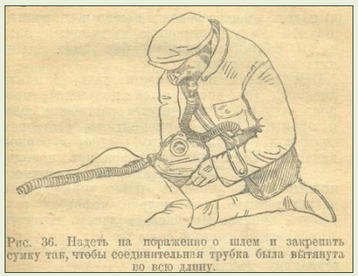 Прежде всего необходимо прекратить воздействие ОВ на организм, т. е. надеть исправный противогаз и выйти из пораженной сферы. Если пораженный не в состоянии этого сделать сам, то на него нужно надеть противогаз и вынести его из отравленного воздуха. Надевание противогаза на отравленного выполняется так: а) вынуть противогаз из сумки и положить на грудь пораженному или рядом с ним; б) приподнять наголову пораженного и положить ее к себе на колени; снять с отравленного головной убор; в) взять шлем за утолщенные края подбородочной части обеими руками так, чтобы большие пальцы обхватывали шлем сверху, а остальные пальцы были внутри шлема; г) надвинуть шлем на подбородок и затем натянуть на голову пораженного; д) надеть на него головной убор и закрепить шнуром сумку противогаза на туловище так, чтобы соединительная трубка была вытянута во всю длину.
