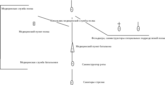 В состав медицинской службы полка входит медицинский пункт полка (МПп), медицинские пункты батальонов (МПб), фельдшера, санитарные инструкторы и - санитары-стрелки подразделений полка.