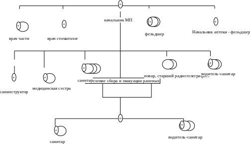 Состав МПп: начальник МП - 1, врачи -2, врач-стоматолог-1, фельдшер-3, начальник аптеки -фармацевт - 1, санитарный инструктор - 3, медицинская сестра-2, санитар-4, повар-1, старший радиотелеграфист-1, водитель-электромеханик-1, старший водитель-1, водитель-санитар-1; всего 22 человека. Кроме того, в состав МП входит отделение сбора и эвакуации раненых; командир отделения -санитарный инструктор-2, старший водитель-2, водители-санитары-4, санитары-4; всего 12 человек.