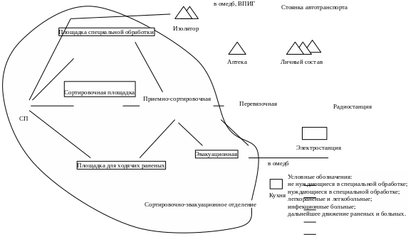 Для развертывания МПп выбирается площадка размером не менее 100х100 м. На площадке развертываются следующие функциональные подразделения: сортировочно-эвакуационное отделение (сортировочный пост, сортировочная площадка, площадка специальной обработки, приемно-сортировочная, эвакуационная), перевязочная, изолятор, аптека. Кроме того, оборудуются площадки для размещения кухни, стоянки транспорта, электростанции, места (помещения) для личного состава и легкораненых. При необходимости в составе МПп развертывается (для оказания первой врачебной помощи) автоперевязочная. В интересах защиты МПп от оружия массового поражения инженерное оборудование места его развертывания начинается немедленно с момента прибытия. В первую очередь оборудуются открытые и перекрытые щели для раненых, больных и личного состава (2-3 щели), возводятся инженерные сооружения для оказания медицинской помощи и размещения тяжелоране