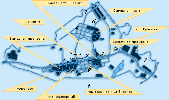 Если говорить о самом городе, то можно выделить 2 основные промышленные зоны: Восточная и Западная. Западная промзона – довольно старый и хорошо обжитый район, и сейчас наблюдается отток разного вида производств в Восточную, особенно на север. По-прежнему, неоспоримо важную роль играет расположенный на западе района в микрорайоне Заозерном трест «Уренгойремгаз». Это единственное предприятие в данном районе, которое не теряет своей значимости и по сей день. Оно занимается строительством административных и производственных зданий, обеспечивает работу таким организациям, как совхоз, база ПТОИК6 и т.д. Сейчас Западная промзона – в основном обслуживающий сектор города. Здесь расположены химчистки, прачечные, ремонтные мастерские и т.д.