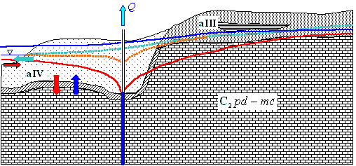 - Во-первых, сократилось ранее существовавшее питание в виде перетекания из известняков; уже один этот факт неминуемо вызовет определенное снижение уровней в аллювии (должен уменьшиться градиент напора в потоке к реке).
