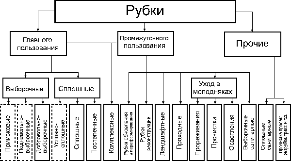 | Рис.17.Система рубок леса, применяемая в российском лесном хозяйстве. Пунктирной рамкой выделены виды рубок, формально в настоящее время не применяющиеся (реально на эти виды рубок приходится не меньше половины от общего объема заготавливаемой в России древесины). |