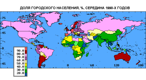 В 1990-е гг. 43% жителей Земли жили в городе. Максимальная в мире доля горожан более 70% - отмечалась в экономически развитых регионах (в Европе, Северной Америке, Австралии),где рост и развитие городов как центров промышленности современного типа началось в период промышленной революции. Наибольшие темпы прироста городского населения здесь в начале 20 века.