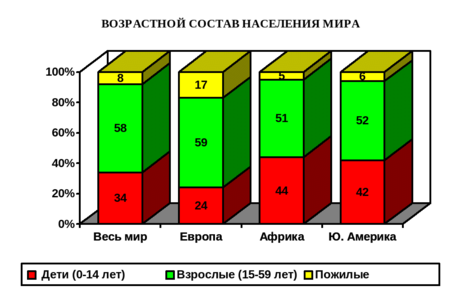 Демографическая проблема – одна из проблем века. Демографический кризис развитых стран привел к нарушению воспроизводства населения, к сокращению его численности. Демографы называют такой процесс депопуляцией. В развитых странах на долю детей до 14 лет приходится 24 %, а в странах Африки – 44 %, на долю пожилых людей старше 59 лет в Европе – 17 %, а в странах Африки – 5 %