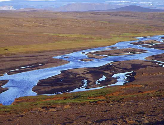 Благодаря обилию осадков в Исландии много довольно крупных рек, но они несудоходны. К югу от Ватнайёкюдля реки разветвляются на рукава, часто меняющие свое положение. Это серьезное препятствие для транспорта. Во время подледниковых вулканических извержений и при прорыве ледяных плотин на приледниковых озерах огромные массы талых вод вызывают бурные паводки на реках. Самые крупные озера Исландии – Тингвадлаватн и Тоурисватн.