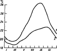 Рис. 1 Годовой ход температуры воздуха над океаном к югу Японии непосредственно над водой (1) и на высоте 100 м. (2)