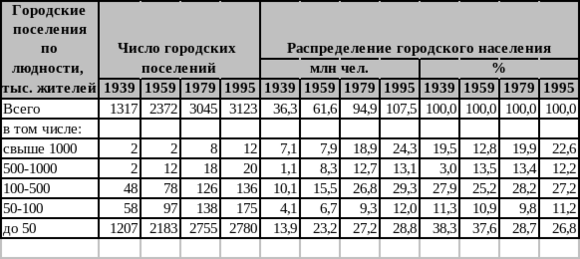 В 1995 г. 168 больших городов сосредоточили 68% городского и 46% общего населения страны. Они отчётливо выделяют основную полосу расселения России и важнейшие звенья её территориально-экономического развития – столичные районы (Московский, С.-Петербургский), основные экономические оси и линии (Волга, Урал, Транссиб), морские побережья и т. д. Города с населением свыше 300 тыс. жителей (63 в 1995 г.) и их окружение составляют строгоорганизованные пространства (термин Е. Е. Лейзеровича), которые подверглись наиболее сильному антропогенному воздействию и являются основной ареной урбанизации в России. На другом полюсе – слабоорганизованные пространства (9/10 всей территории), редко заселённые (средняя плотность около 3 чел./кв. км) и слабоосвоенные с редкой сетью коммуникаций.