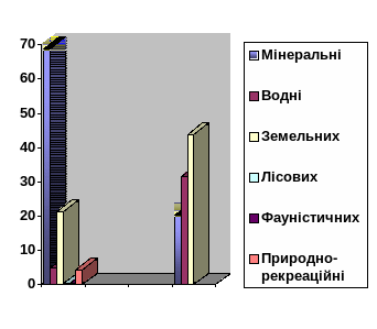 | Мінеральних | Водних | Земельних | Лісових | Фауністичних | Природно-рекреаційних | |