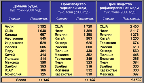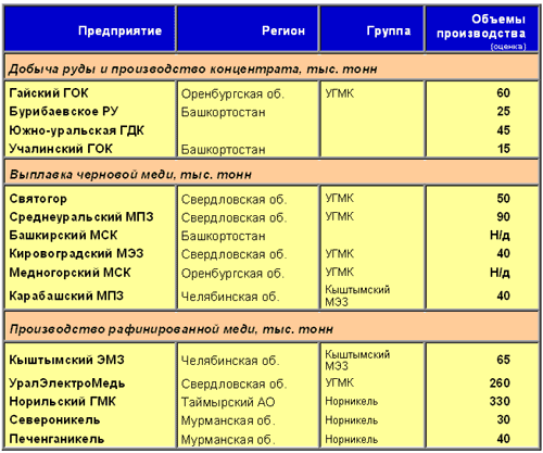 Как уже было отмечено выше, крупнейшие мировые производители меди сосредоточены, как правило, в районах залегания медных руд. Кроме того, следуя последним тенденциям на рынках, все крупнейшие производители меди в течение конца 90-ых начале 2000 года проводили активные процессы укрупнения и консолидации. Не обошла стороной данная тенденция и представителей России. Так, после ряда объединений на медном рынке в стране сформировалось устойчивое равновесие, поддерживаемое двумя крупнейшими игроками – Уральской горно-металлургической компанией (УГМК), объединяющей в основном европейские предприятия по выпуску и добычи меди в России, и ГМК «Норильский никель», консолидировавшей в основном северные предприятия отрасли. Обе эти компании являются крупнейшими и занимают высокие позиции в мировой табели о рангах медных производителей.