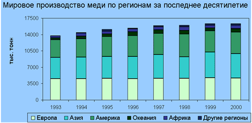 За последние два десятилетия существенно изменилась география добычи и производства меди. На смену традиционным местам добычи, так называемым «старым медедобывающим районам» (Заир, Замбия, Папуа-Новая Гвинея), где промышленные запасы сильно истощены и дальнейшая их разработка относительно дорога и общая добыча переживает существенный спад, пришли новые региональные производители, прежде всего из Южноамериканского континента, Океании и Австралии. Кроме того, открытие новых крупных месторождений привело к инвестиционному буму в отрасли и подтолкнуло ее интенсивное развитие. Ряд крупнейших инвестиционных проектов на новых месторождениях в Чили и Индонезии, где добыча ведется открытым способом, сделал эти державы ведущими производителями медной руды. В последние несколько лет Чили обогнала и ушла далеко вперед от США, занимавших ранее первое место по добыче медной руды. Индонезия ворвалась в первую десятку производителей медной руды благодаря инвестициям в разработку лишь одного месторождения Грасберг в провинции Ириан-Джая.