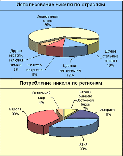 Более 80% добытого металла используется при производстве различных сплавов: легированные и высокопрочные стали, сплавы цвтных металлов и т.п. Из этой массы порядка 60% приходится на стальное производство, вследствие чего рынок никеля существенно ориентирован на конъюнктуру рынка черных металлов, как на основного своего потребителя (график 2).