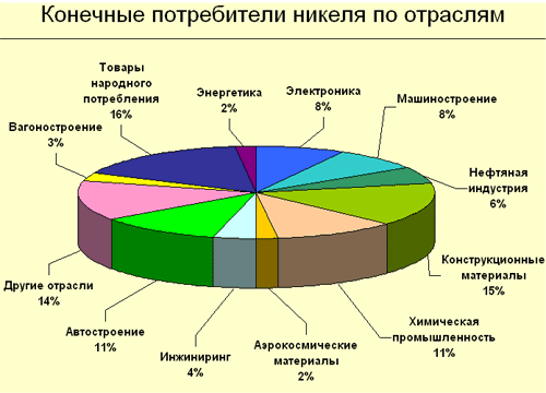 Потребление по секторам промышленности сплавов никеля также различно. Наибольшим спросом металл пользуется в индустрии, занятой производством товаров народного потребления, инженерии, строительстве (подробнее см. график 11).