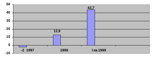 В отрасли растёт рентабельность производства. Если за 1998 г. она составляла(+12,9%), то за I кв. 199г. – (43,7%) (рис3). Снизились затраты на 1 рубль товарной продукции с 101,1 коп. в I кв. 1998г. до 77,2 коп. в I кв.1999 (рис 4).