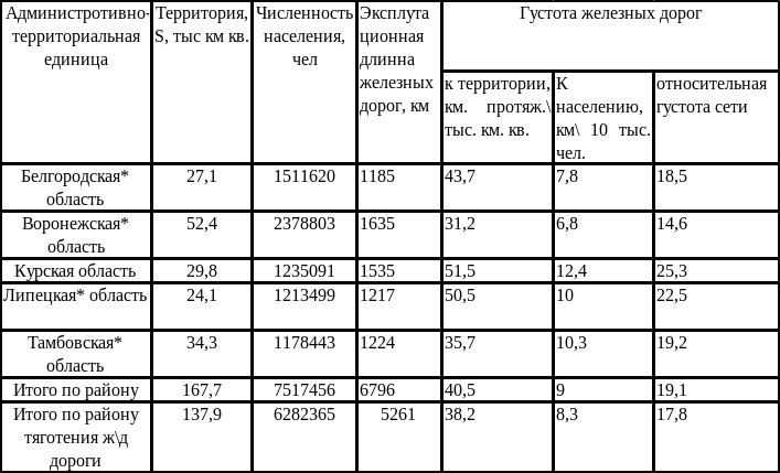 III. Расчет густоты железнодорожной сети по областям, входящим в район тяготения и по району в целом.