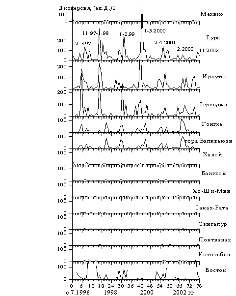 По всем станциям для каждого отдельного месяца в интервале 7.1996 г. - 12.2002 г. была рассчитана стандартная дисперсия, величина которой служит здесь как статистическая мера изменчивости озона. На рис.8 представлены временные вариации рассчитанных ежемесячных значений дисперсии ОСО. Видно, что дисперсия ОСО претерпевает значительные изменения в зависимости от широты. На приэкваториальных станциях дисперсия очень мала: самые большая дисперсия для 7-ми станций вплоть до Вьетнамского региона (ст. Ханой) не превышает 18 ед.Д.2 На станциях в Китайском регионе и далее в Сибири и на Севере наблюдается очень сильная изменчивость общего содержания озона – например, на ст. Тура в середине зимы 2000 г. дисперсия озона достигла 558 ед.Д.2. Изменчивость ОСО с ростом широты в Северном полушарии, начиная от ст. Ханой, возрастает. Отчетливо заметна зависимость изменчивости ОСО от сезона года: в основном, все максимумы дисперсии приходятся на зимний период времени. Дисперсия ОСО, как видно из рис.8, меняется и год от года: самая высокая изменчивость ОСО наблюдалась в 1998 г. и в 2000 г., немного меньше - в 1997 г. и в 1999 г. Дисперсия значительно уменьшилась после 2000 г., особенно на станциях Терелджи, Иркутск и Тура..