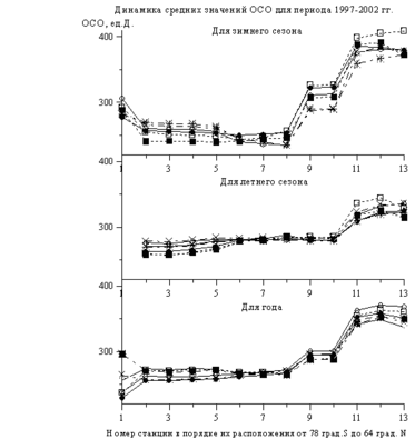 Рис.4 иллюстрирует широтный ход изменчивости средних значений ОСО вдоль долготной цепочки 100-110° Е 1. среднезимних ( 1996/1997 гг. - 2001/2002 гг.); 2. среднелетних ( 1997 г. - 2002 г.); 3. среднегодовых значений ОСО ( 1997 г. - 2002 г.). Здесь используется неравномерная по широте шкала, рассматриваемые станции располагались в порядке изменения их широты от ст. Восток в Южном полушарии до ст. Тура на Крайнем Севере - по их порядковым номерам в табл.1. Как видно из рис.4, для среднегодовых значений и, особенно, для среднезимних значений ОСО во все рассматриваемые годы средние значения общего содержания озона поднимаются от экватора к северному полюсу ступенями: первое возрастание значений ОСО по сравнению